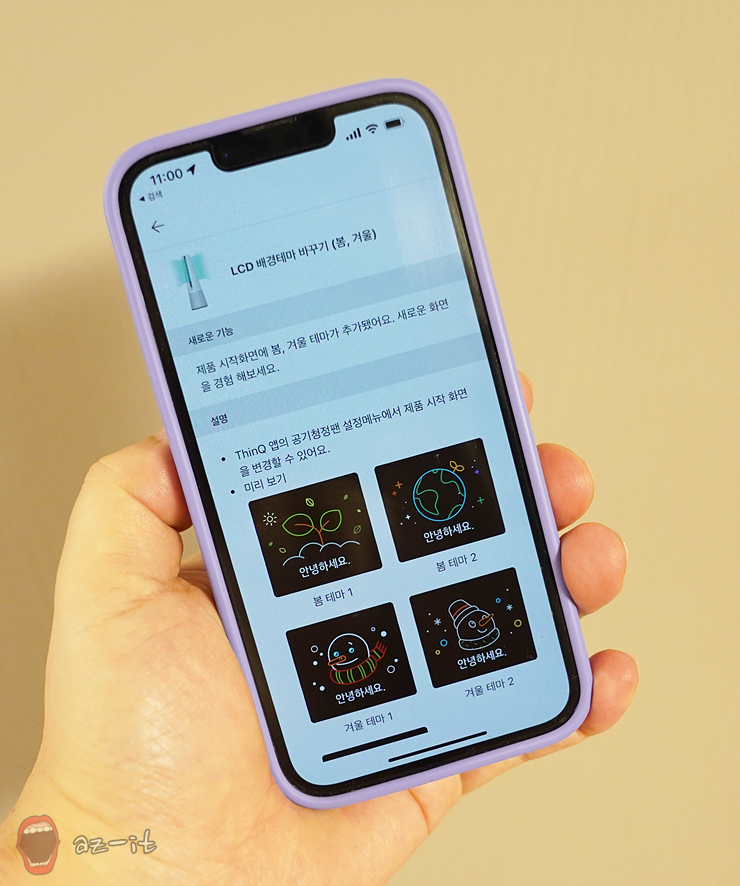 LG ThinQ앱을 이용해 LCD 배경테마와 제품 시작화면을 설정해보았습니다. 계절에 따른 배경화면부터 기본적인 인사 화면까지 다양하게 준비되어 있는데요, 계절에 따라 기분에 따라 배경화면을 바꿀 수 있는 점은 같은 듯 다른 가전을 사용하는 듯한 기분이 들게 만들어 주었습니다.