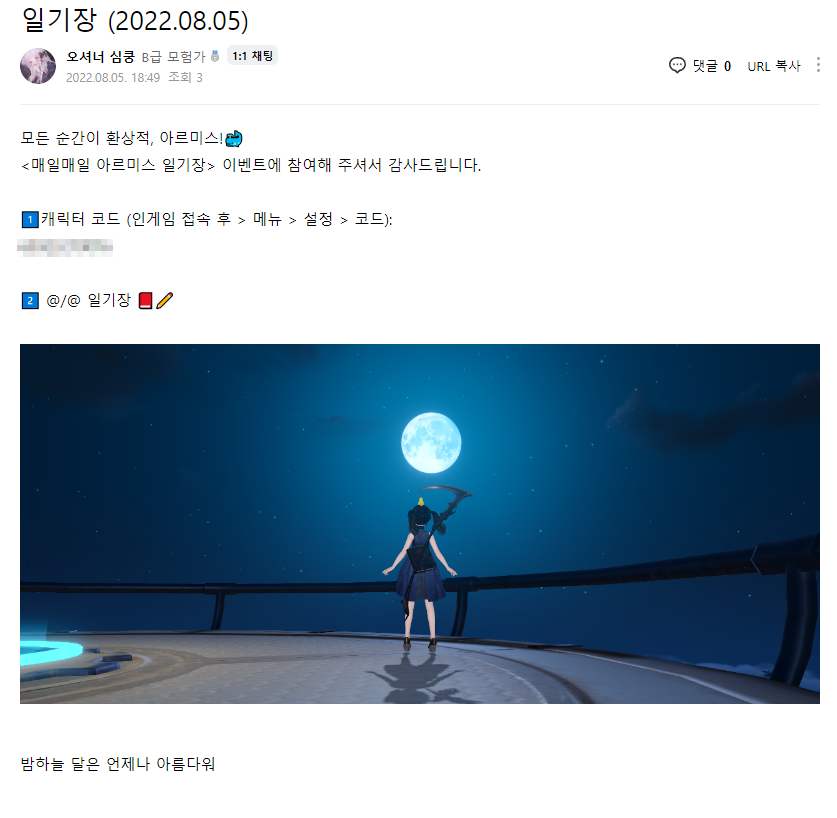 매일매일 아르미스 일기장 게시판에는 벌써부터 많은 유저들의 플레이 일기가 올라오고 있는 중인데요, 생각보다 암살자 캐릭터를 선택한 분들이 많아 놀랐습니다. 아르미스 일기장 이벤트는 모든 참여자에게 인게임 아이템을 지급하고 내부 심사를 걸쳐 1등부터 3등까지는 문화상품권 3만원권을 4등부터 5등까지는 아르미스 잠옷 굿즈(블루, 핑크 택 1)를 선물로 지급합니다.