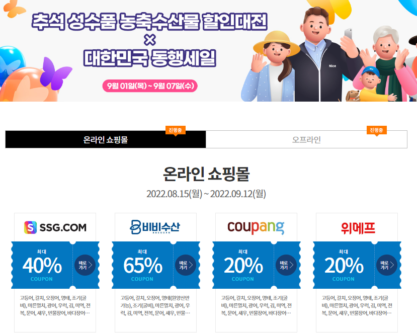 9월 1일부터 시작된 동행세일과 함께 2022 추석 성수품 농축수산물 할인대전이 시작되었습니다. 9월 12일까지 진행되는 이번 농축수산물할인대전은 농림축산식품부와 해양수산부가 치솟는 물가로 인한 내수 위축을 극복하고 추석 명절 소비자의 체감물가 안정에 선제적으로 대응하기 위해 공동개최로 진행됩니다.