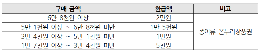 환급은 종이류 온누리 상품권으로 수령 가능한데요, 행사 기간 내 참여 시장 및 참여 점포 영수증 합산으로 정해진 구매 금액을 충족하면 그에 따른 환급액을 받을 수 있습니다. 영수증은 당일 영수증에 한하며 시장 내 예산 소진 시 행사가 빠르게 종료될 수 있다고 하니 서두르면 좋을 것 같습니다.