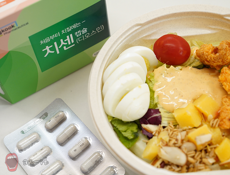 치센의 주요성분인 디오스민은 감귤류에서 추출하는 헤스페리딘에서 구조를 변형시켜 만드는 식물성 플로보노이드 성분입니다. 디오스민을 주성분으로 하는 만큼 치질의 주요 증상인 통증과 출혈을 완화 시키는데 도움을 주는데요, 1일 2회 점심과 저녁 식사 시 복용하는 방식입니다.