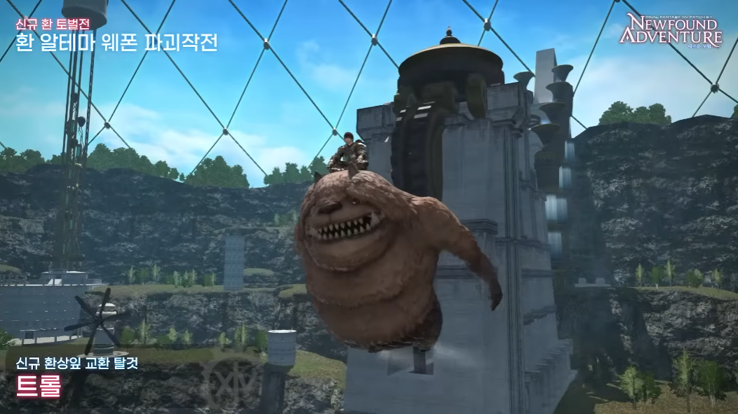 신규 환 토벌전 환 알테마 웨폰 파괴작전도 등장합니다. 투사/마법사 레벨 90, 평균 아이템 레벨 560 이상 참여할 수 있고 최소 1인부터 최대 8명 파티를 구성해 도전할 수 있습니다. 또한 환상잎으로 교환할 수 있는 신규 탈것 트롤도 추가되었는데요, 개성 넘치는 외형은 기본 보기 드문 탈것이라는 점에 있어 수집할 이유가 충분합니다.