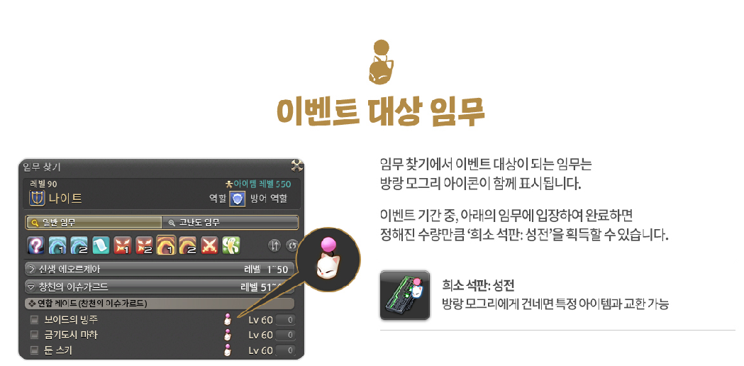 온라인RPG게임 파이널판타지14 V6.1 업데이트를 앞두고 진행되는 모그모그 컬렉션 이벤트도 빼놓을 수 없는 소식 중 하나입니다. 10월 4일 V6.1 업데이트 전까지 진행되는 이벤트로 희소 석판: 성전을 모아 방랑 모그리가 준비한 특별한 보상으로 교환할 수 있습니다.
