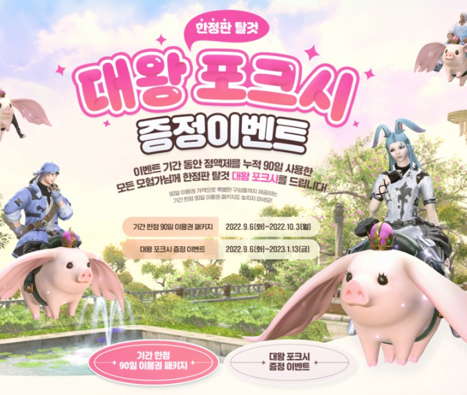 이벤트 기간 동안 정액제를 누적 90일 사용한 모든 모험가에게 한정판 탈것 대왕 포크시가 주어지는 증정 이벤트도 10월 3일까지 진행됩니다. 증정 이벤트와 함께 진행 중인 이용권 패키지를 구입하면 집사 고용권부터 초보보 가방 등의 다양한 편의 아이템을 획득할 수 있으니 다가올 V6.1 업데이트를 대비해 이번 기회를 잡아 필요한 아이템도 득템하고 대왕 포크시도 획득하는 일석이조의 기회를 놓치지 마시기 바랍니다.