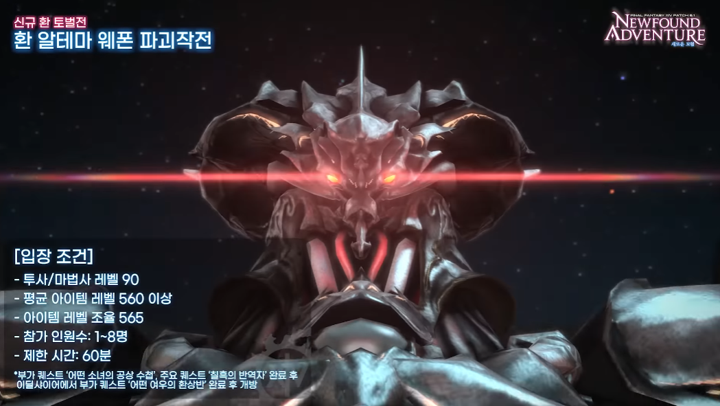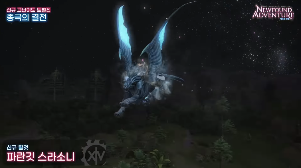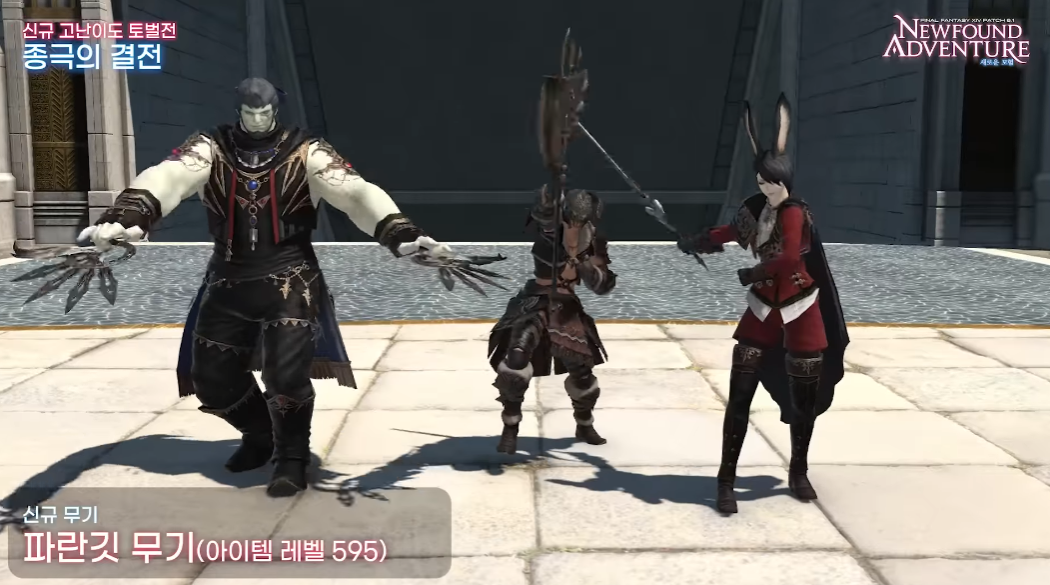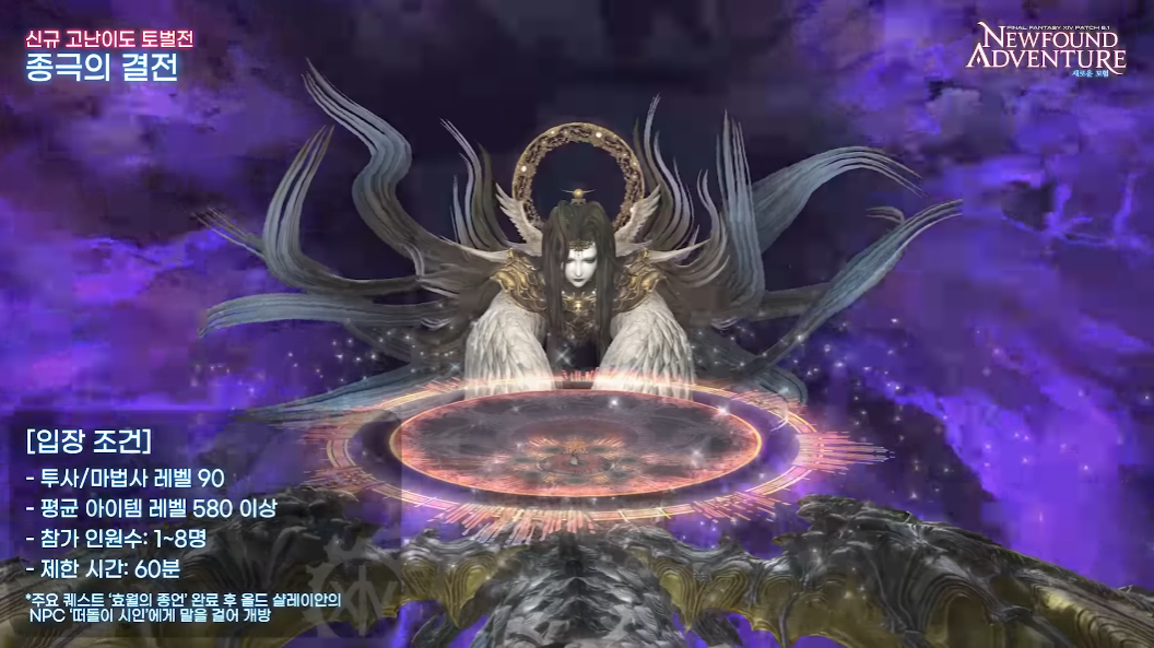 신규 고난이도 토벌전 종극의 결전도 추가됩니다. 투사/마법사 레벨 90, 평균 아이템 레벨 580 이상이면 입장 가능하면 1~ 8명 파티로 참여할 수 있습니다. 60분이라는 제한시간이 있지만 해당 공략 시 595 레벨 신규 무기 파란 깃과 신규 탈것 파란깃 스라소니를 얻을 수 있어 도전욕을 자극합니다.