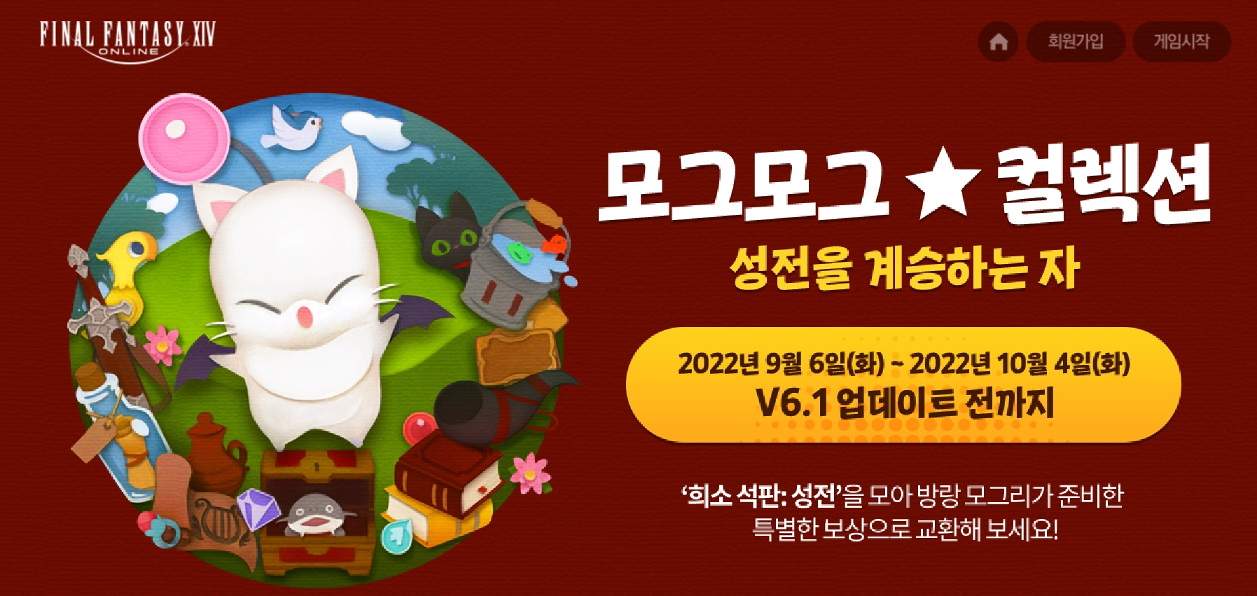 온라인RPG게임 파이널판타지14 V6.1 업데이트를 앞두고 진행되는 모그모그 컬렉션 이벤트도 빼놓을 수 없는 소식 중 하나입니다. 10월 4일 V6.1 업데이트 전까지 진행되는 이벤트로 희소 석판: 성전을 모아 방랑 모그리가 준비한 특별한 보상으로 교환할 수 있습니다.