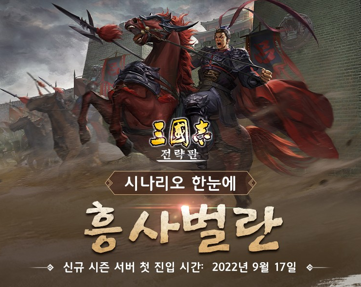 신규 시나리오 흥사벌란도 적용될 예정입니다. 신규 시즌 서버 첫 진입은 9월 17일이며 신규 시나리오에서는 삼전 인게임 첫 번째 던전인 호로관이 등장하며 수화계략 및 등용령 전략이 업그레이드됩니다. 또한 신규 장수 SP여몽 등이 등장하고, 신규 사건 전법 핏빛 전투가 등장해 개척의 재미를 더해줄 것으로 기대됩니다.