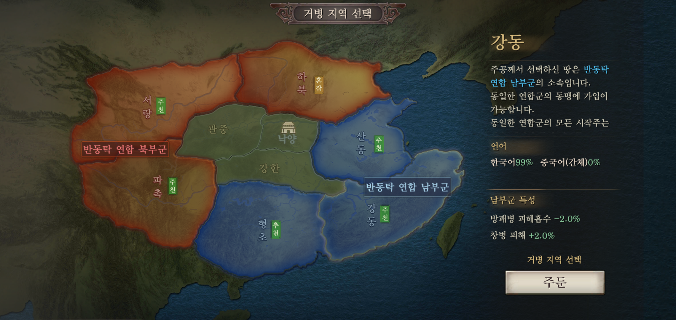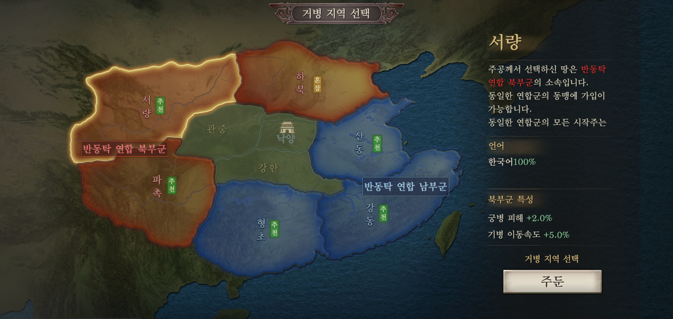 하북 서량, 파촉은 반동탁 연합 북부군에 해당되며 기병 상단에 위치한 앞 3개 주의 특성을 통합해 기병 이동속도와 궁병 피해 특성을 받을 수 있고 형초, 강동, 산동 반동탁 연합 남부군 진역을 선택하면 창병 피해와 방패병 피해흡수 특성이 주어지며 지역 간 밸런스 불균형이 사라져 기존보다 빠른 전개가 펼쳐지는 방식입니다.