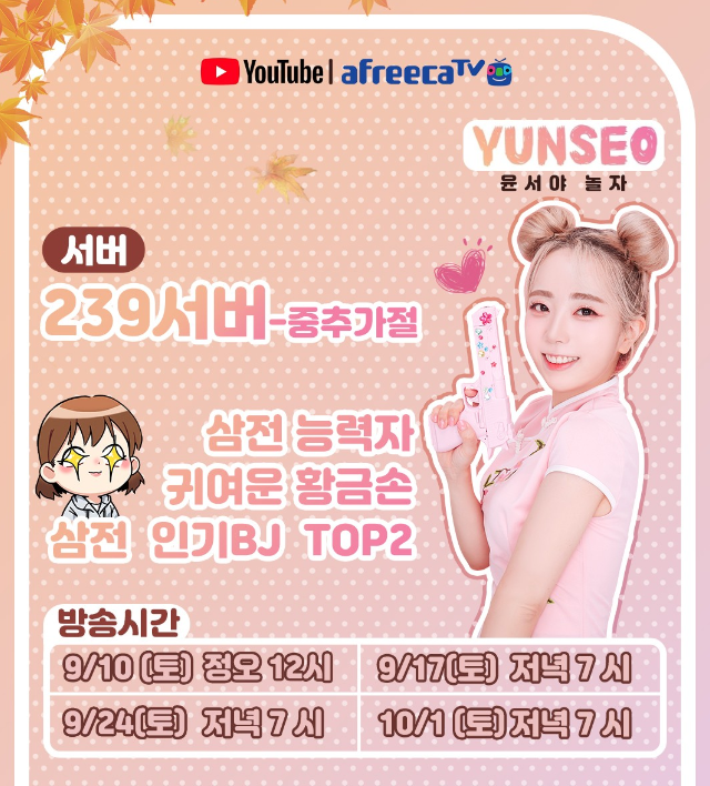 신규 서버오픈과 함께 특별한 BJ프로모션도 진행 중입니다. 9월 10일 첫 방송을 시작으로 9월 17일, 9월 24일 그리고 10월 1일에 BJ윤서야 라이브 방송이 진행되는데요, 라이브 방송에서는 신규 시즌1 플레이 방법도 전달하고, 방송 도중 푸짐한 인게임 보상과 쿠폰이 공개되니 놓치지 말아야겠습니다.