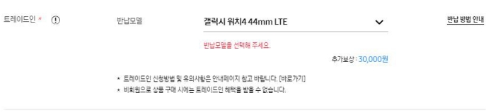 구매하기로 넘어가 트레이드인 항목까지 모두 동의한 다음 어떤 제품을 반납할지 모델을 선택하면 추가 보상금을 확인할 수 있고 구매 비용에 반영됩니다. 이때 반납 가능한 기종은 갤럭시 워치4 클래식 42mm I 46mm, 갤럭시 워치 4 40mm I 44mm, 갤럭시 워치 3 41mm I 45mm, 갤럭시 워치 42mm I 46mm, 액티브 2 40mm I 44mm, 액티브 40mm 에서 선택할 수 있는데요, 기종에 따라 최대 5만 원 비용의 보상을 받을 수 있습니다.
