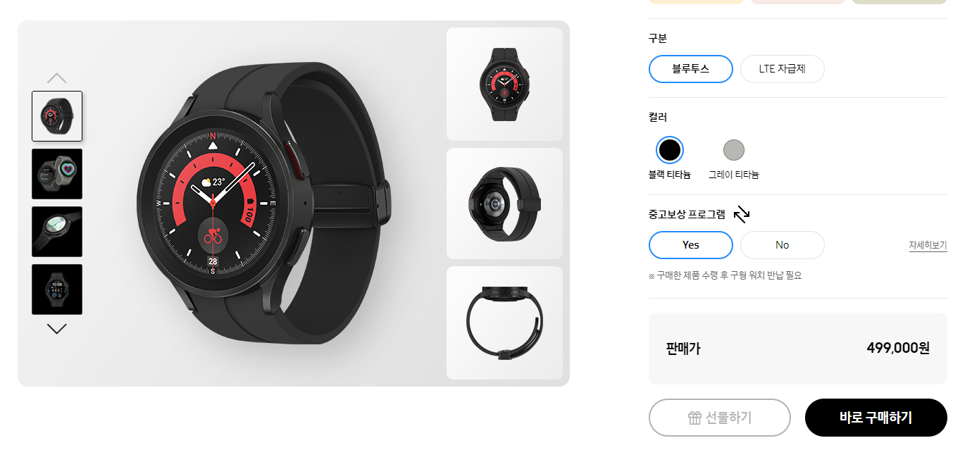 갤럭시 워치 5 트레이드인 프로모션은 삼성 홈페이지에 접속해 워치 5 시리즈 구매하기 버튼을 눌러 원하는 디자인과 컬러를 시작으로 블루투스/LTE 자급제 구분까지 챙겨 원하는 모델을 선택합니다. 그리고 하단 중고보상 프로그램 선택지에서 YES를 눌러 구매하기를 진행하면 됩니다.