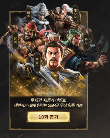 10월 19일까지 진행되는 무제한 재 뽑기 이벤트도 놓칠 수 없습니다. 이벤트 기간 동안 계정마다 매일 최대 50회까지 재 뽑기가 가능하며 결과는 최대 10회까지 확인 가능합니다. 이후 이벤트 종려 전까지 1회 뽑기 결과를 선택하고 수령할 수 있는데요, 뽑기 결과는 총 20가지로 구분되어 있으며 결과에서 반드시 SSR 장수*2가 포함되어 있다고 합니다. 이후 선택한 장수는 정식 론칭 후 쿠폰으로 지급되어 수령 가능합니다.