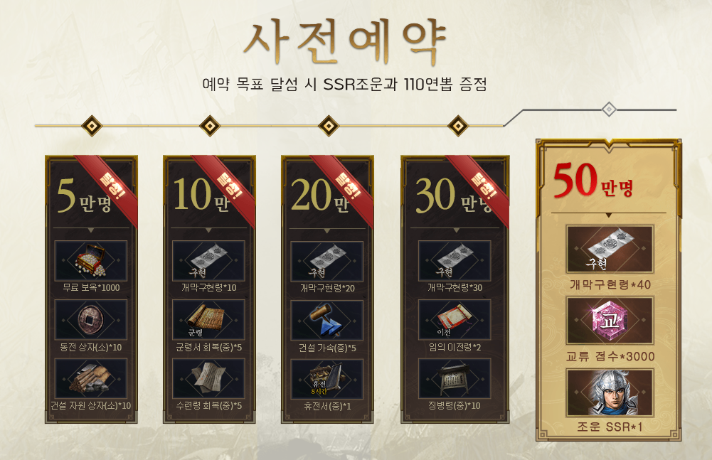 누적 사전예약 인원수에 따라 주어지는 추가 보상도 상당합니다. 5만 명을 시작으로 10만, 20만, 30만 그리고 50만 명을 넘어설 때마다 누적하여 보상이 주어지는데 30만 명은 이미 넘어선 상황이다. 50만 명도 얼마 남지 않아 SSR 등급 조운과 110연뽑까지 획득하는 건 당연하게 생각해도 될 것으로 보입니다.