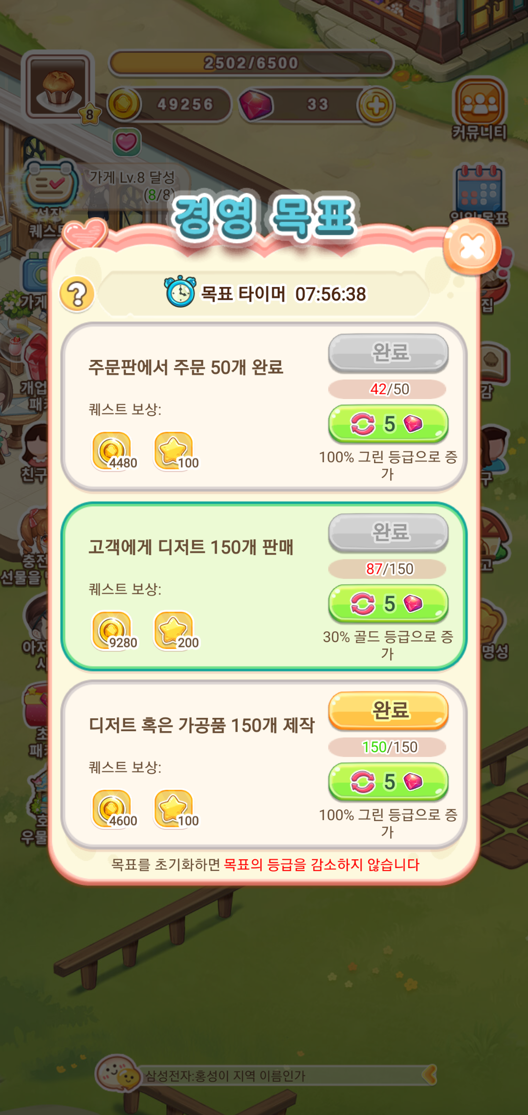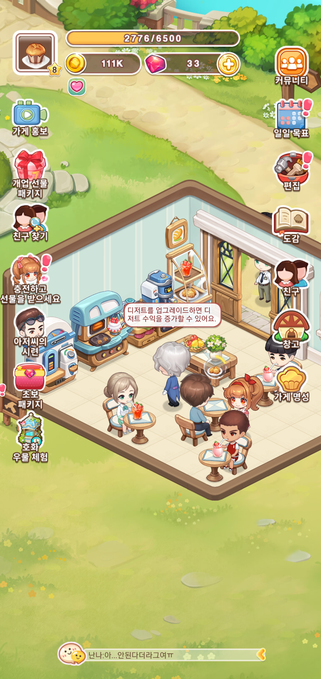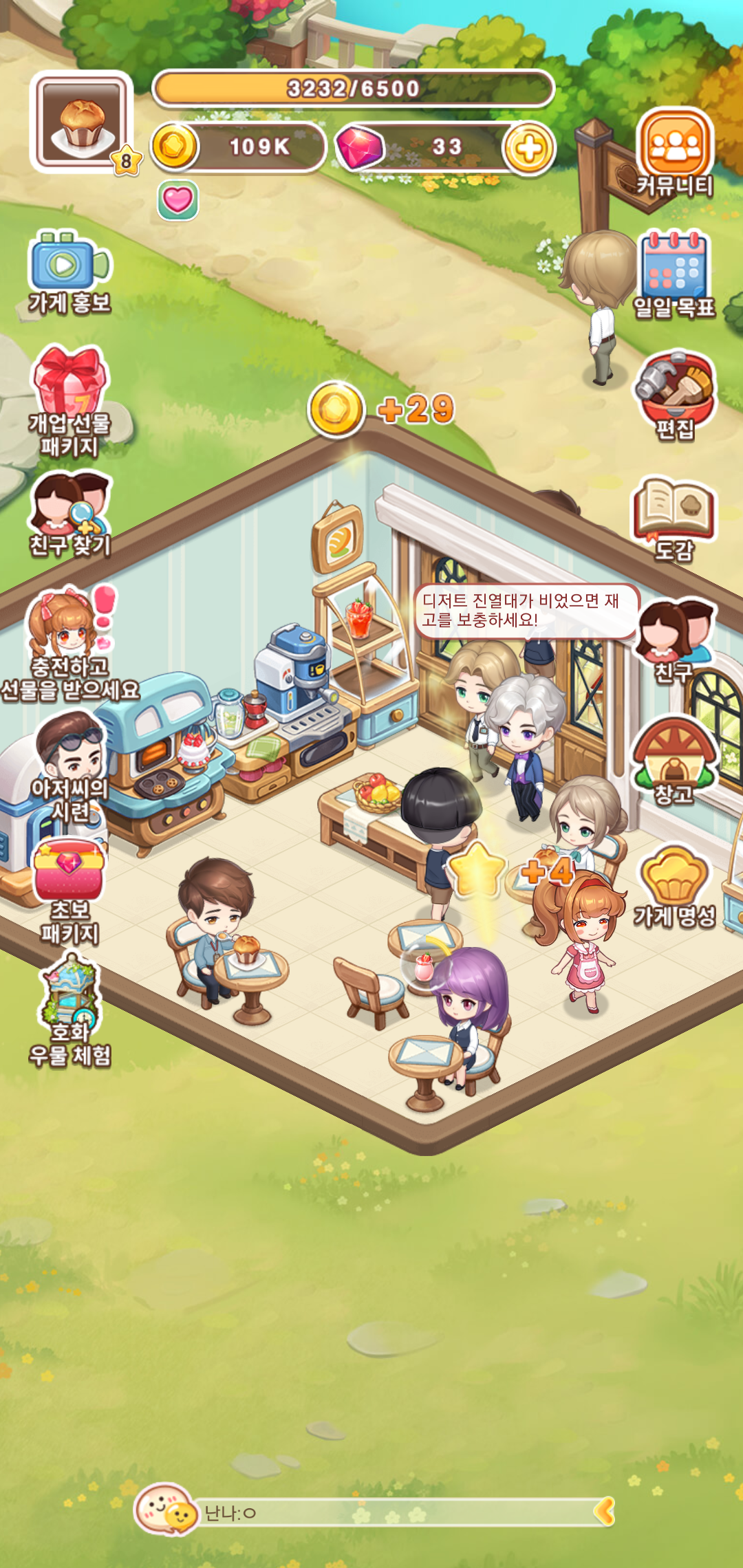 육성게임 두근두근디저트카페는 나만의 디저트 가게를 확장하고 성공하는 목표를 가지고 경영을 진행하게 됩니다. 경영형 시뮬레이션을 바탕으로 하는 만큼 성공을 위한 다양한 단계를 거치면서 필요한 재화를 획득하고 지속적인 성장을 하게 되는데요, 일일 목표를 바탕으로 주어지는 퀘스트를 클리어하면서 진행하다 보면 어느새 점점 커지는 카페의 모습을 확인할 수 있습니다.
