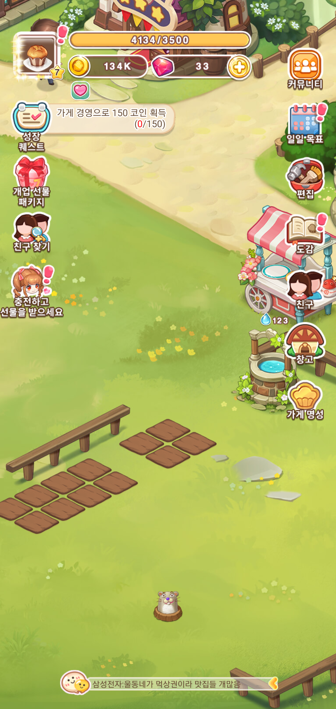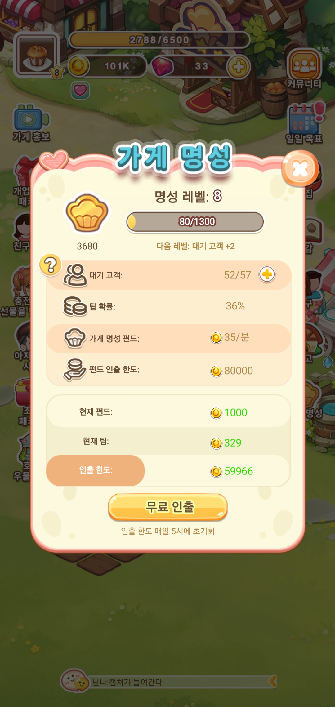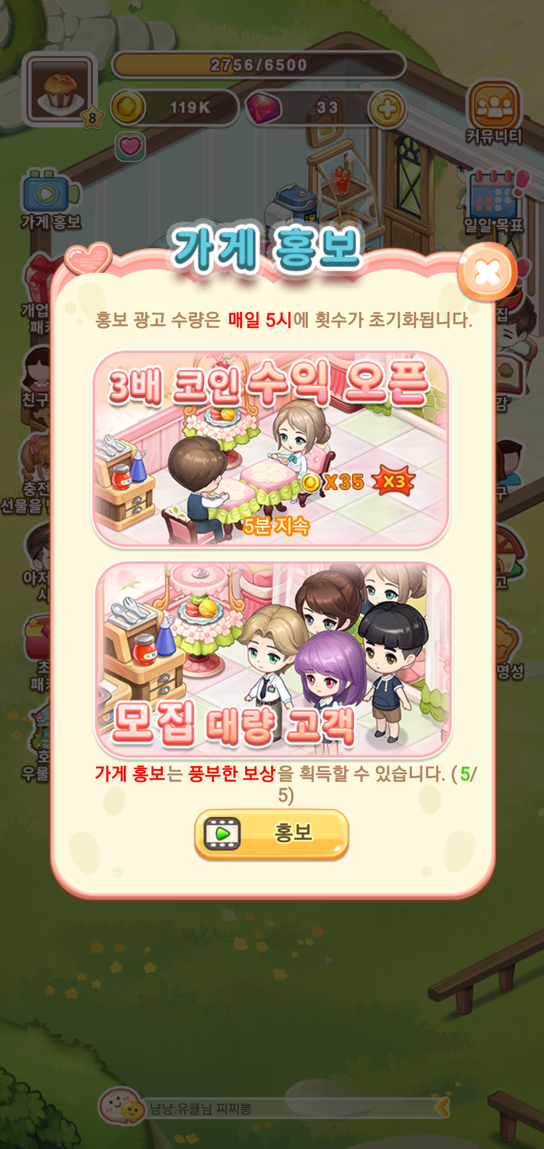 육성게임 두근두근디저트카페는 나만의 디저트 가게를 확장하고 성공하는 목표를 가지고 경영을 진행하게 됩니다. 경영형 시뮬레이션을 바탕으로 하는 만큼 성공을 위한 다양한 단계를 거치면서 필요한 재화를 획득하고 지속적인 성장을 하게 되는데요, 일일 목표를 바탕으로 주어지는 퀘스트를 클리어하면서 진행하다 보면 어느새 점점 커지는 카페의 모습을 확인할 수 있습니다.