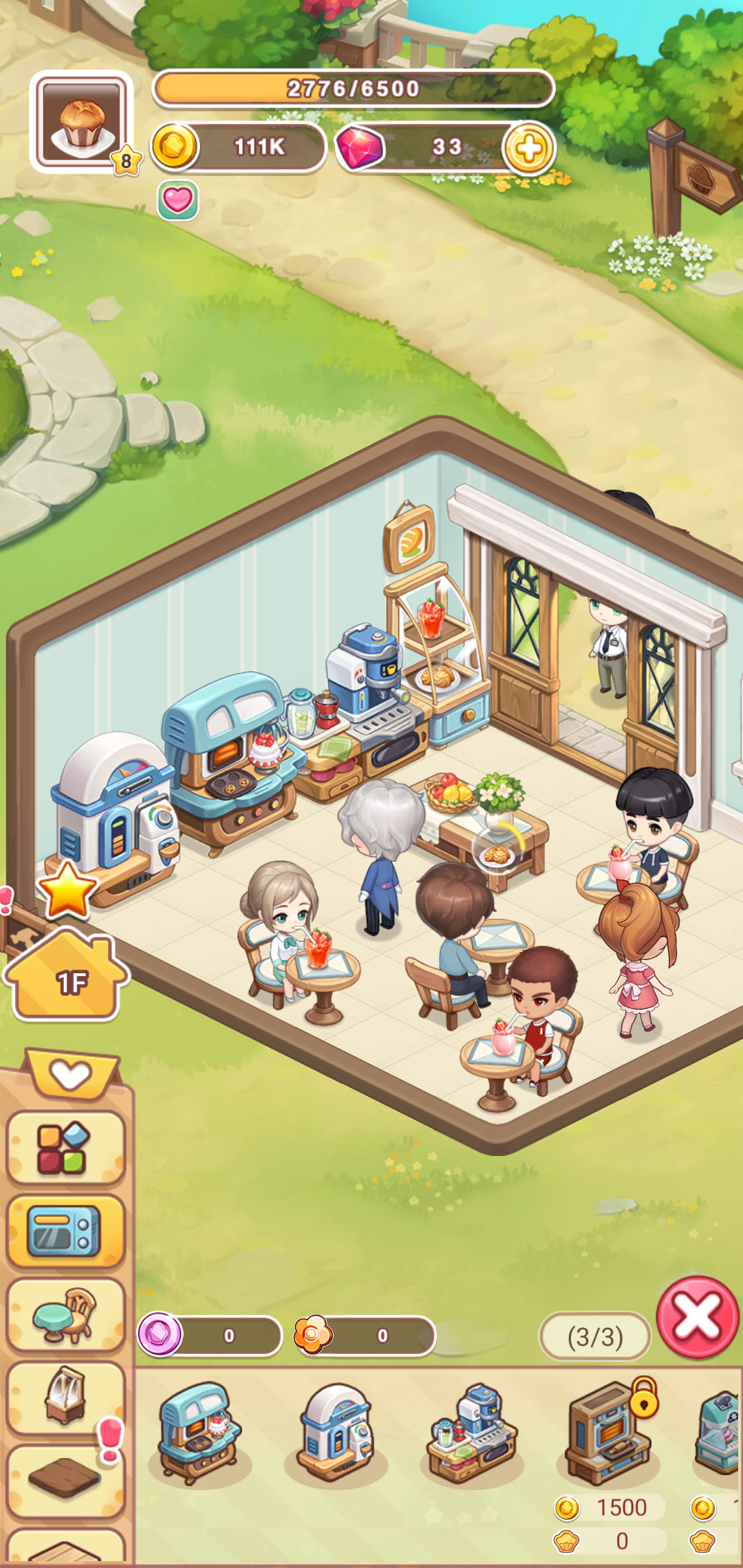 카페를 원하는 모습으로 꾸미는 커스터마이징 기능도 준비되어 있는데요, 레벨이 올라갈수록 카페를 더욱 확장할 수 있고, 필요한 가구를 배치할 수 있습니다. 특히 가게 명성에 따라 구매하고 배치 가능한 가구들이 다양하게 준비되어 있고, 명성에 따른 수익도 달라지기 때문에 어느 것 하나 소홀히 할 수 없을 정도입니다.