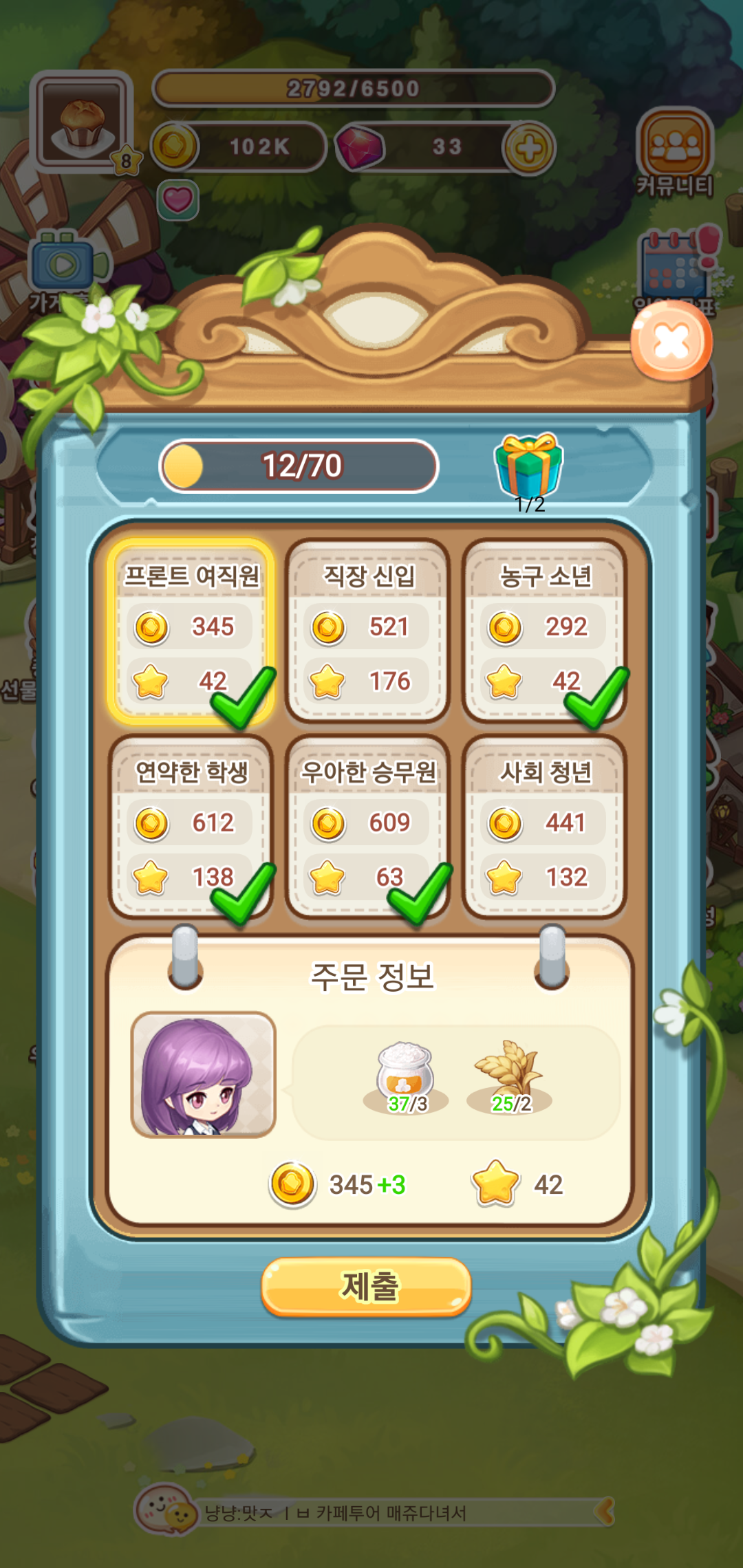 시뮬레이션게임 두디카는 카페를 운영하면서 완성된 디저트를 판매하는 것 외에도 주문판을 통해 다양한 주문을 받을 수 있기도 합니다. 주문에 따라 획득하는 골드와 경험치가 다르고, 모든 주문을 완료하면 초기화까지 일정 시간이 걸리지만, 빠르게 골드와 경험치를 획득할 수 있어 레벨을 올리는데 무척이나 유용합니다.