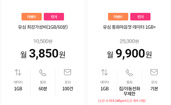 데이터가 크게 필요하지 않는 분들을 위한 최강 가성비 요금제도 준비되어 있는데요, 유심 최강 가성비 요금제라던가 유심 통화 마음껏 데이터 요금제의 경우 1만 원 이하 비용으로 통신비를 절약할 수 있습니다. 특히 유심 통화마음껏 데이터 1GB+ 요금제의 경우 데이터를 모두 소진하면 최대 1Mbps 속도로 계속 사용 가능해 데이터를 크게 사용하지 않지만 1GB는 부족하다 싶은 분들에게 딱 좋은 요금제가 아닐까 싶습니다.
