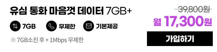 유심 통화 마음껏 데이터 7GB+요금제도 준비되어 있는데요, 월 17,300원의 비용으로 7GB 데이터/ 통화 무제한/ 문자 기본제공의 혜택을 받을 수 있습니다. 데이터의 경우 7GB를 모두 소진하면 1Mbps 속도로 무제한 사용 가능하기 때문에 사실상 데이터 또한 무제한으로 이용 가능하다고 볼 수 있습니다.