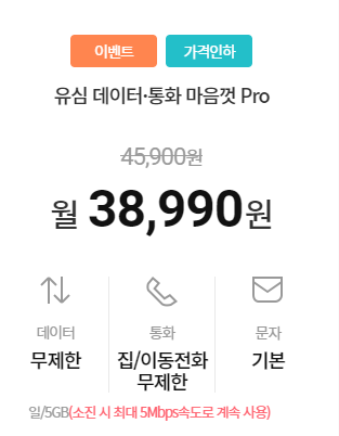 유알모 주요 요금제 중 유심 데이터/ 통화 마음껏 Pro 요금제는 월 38,990원으로 데이터를 무제한 사용 할 수 있는 요금제입니다. 데이터뿐만 아니라 집/ 이동전화도 무제한으로 이용 가능하고 문자 또한 무제한으로 제공됩니다. 데이터의 경우 일 5GB를 제공하며 소진 시 최대 5Mbps 속도로 마음껏 사용할 수 있습니다.