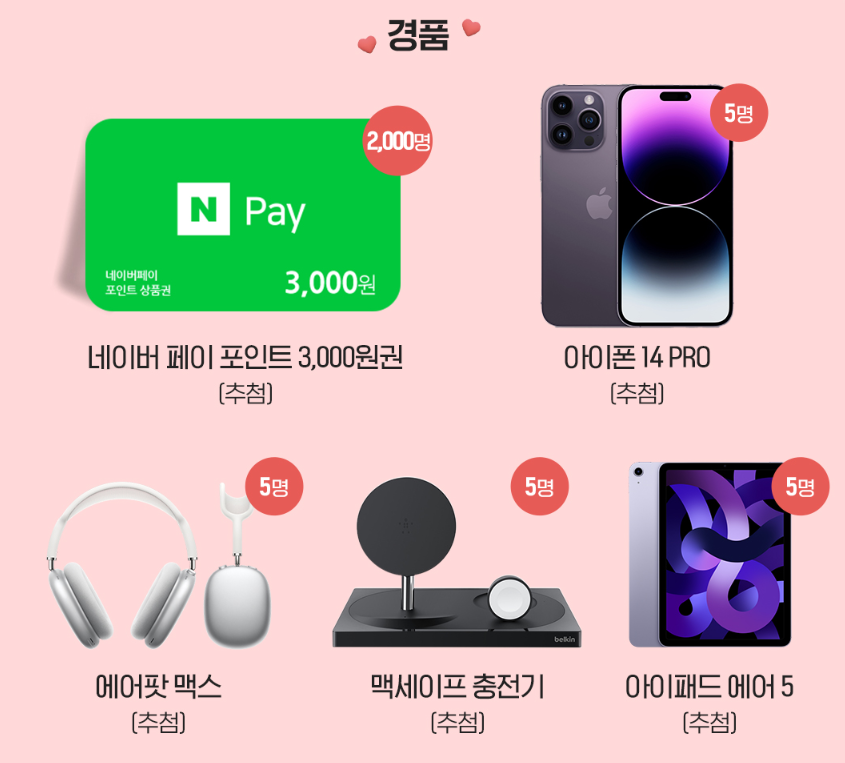 마이알뜰폰 회원가입 프로모션에 참여한 분들 중 추첨을 통해 대박 선물이 주어지는데요, 무려 2천명에 달하는 인원에게는 네이버 페이 포인트 3,000원권이 지급되고 총 20명을 추첨해 아이폰 14 PRO, 에어팟 맥스, 맥세이프 충전기, 아이패드 에어 5 선물이 주어집니다.