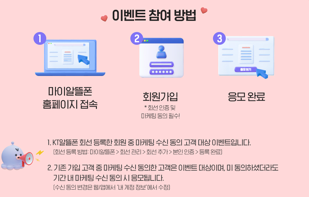 10월 31일까지 진행되는 마이알뜰폰 회원가입 프로모션은 참여 방법도 간단합니다. 마이알뜰폰 홈페이지에 접속한 후 회원가입을 진행하고 해당 프로모션에 응모하면 완료되는데요, 이때 KT알뜰폰 회선 등록한 회원이어야 하며 마케팅 수신 동의가 되어야만 참여할 수 있습니다.