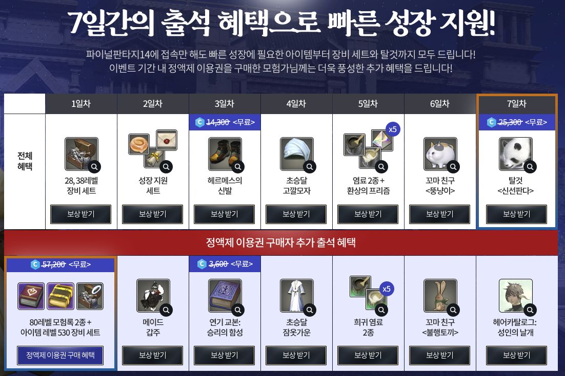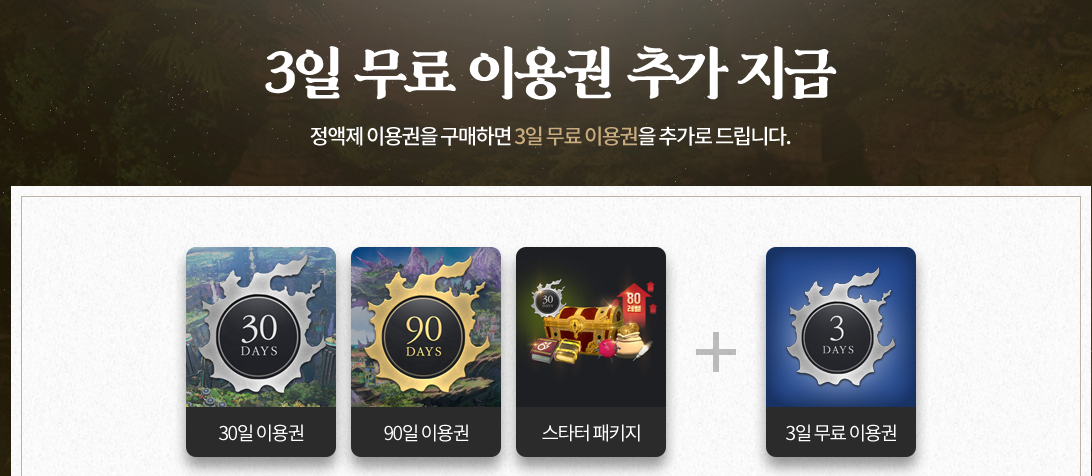 신규 유저의 경우 7일간의 출석 이벤트 혜택을 통해 빠른 성장을 지원을 받을 수 있습니다. 여기에 정액제 이용자 구매자의 경우 추가 출석 혜택까지 주어져 빠른 성장이 가능합니다. 또한 30일 이용권을 50% 할인된 비용으로 구입할 수 있어 신규 유저에게 주어지는 혜택이 어마어마할 정도입니다.