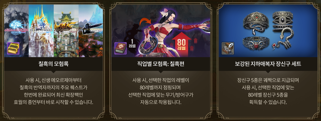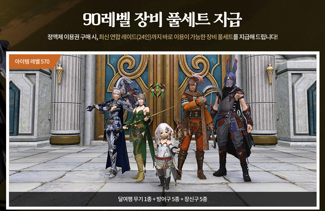 복귀 유저가 정액제를 결제하면 3일 추가 이용권이 지급되고, 최신 연합 레이드 24인까지 바로 이용이 가능한 90 레벨 장비 풀세트가 함께 지급되어 스펙에 대한 부담 없이 복귀와 함께 파판 14의 새로운 스토리를 바로 즐길 수 있습니다.