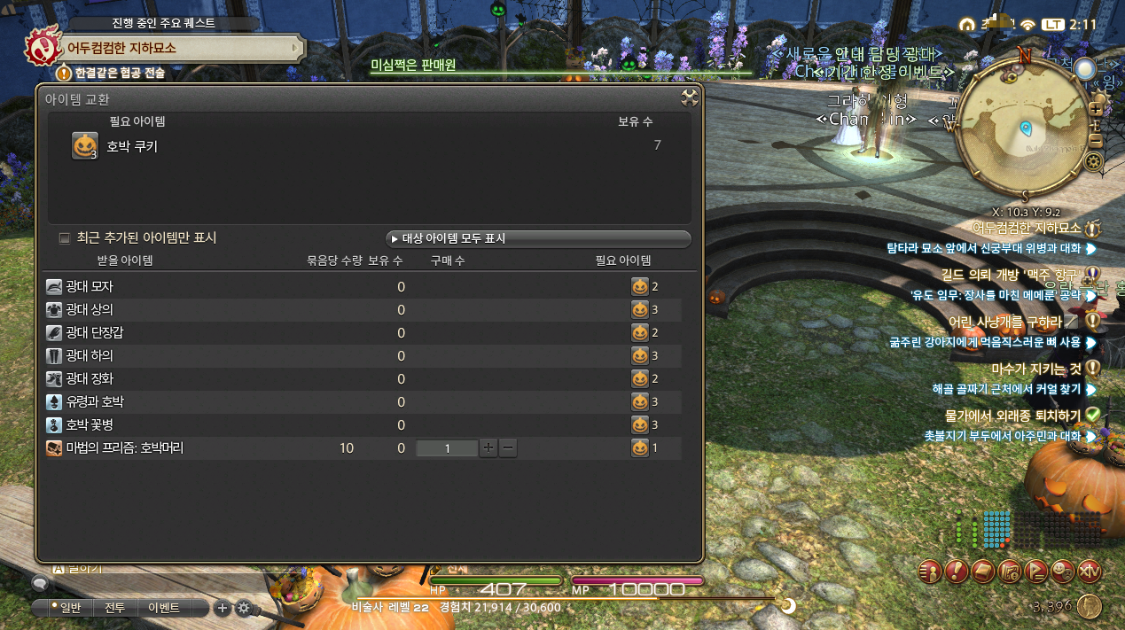퀘스트를 완료하고 획득한 호박쿠키는 미 케토 야외음악당에 위치한 기간 한정 상인 NPC 미심쩍은 판매원을 클릭해 다양한 광대 의상 세트와 필요한 아이템을 구입할 수 있도록 구성되어 있습니다. 전체 아이템을 구매하는데 필요한 호박 쿠기 양도 많지 않아 이벤트 기간 조금만 신경 쓰면 모든 아이템을 획득하기 어렵지 않을 정도입니다.