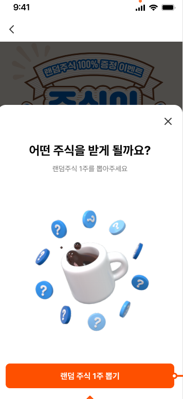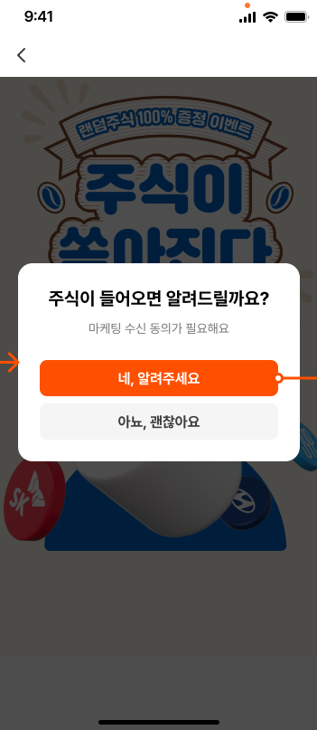 이벤트 신청하기 버튼을 클릭하면 랜덤 주식1주 뽑기 버튼을 선택할 수 있는데요 계좌가 연동되어 있지 않거나 생성이 필요하면 계좌 연동 또는 새로 만들기 버튼이 활성화됩니다. 이때 미리 연동된 계좌가 있다면 랜덤 주식이 들어왔을 때 알람을 받을 것인지 여부를 확인하는 메시지를 받게 됩니다.