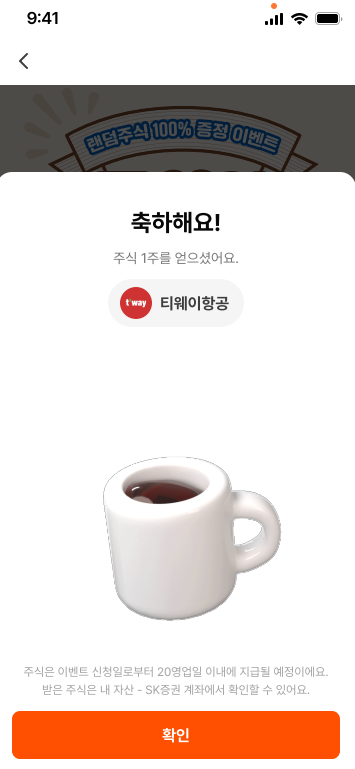 알람 수신을 동의하거나 동의하지 않음 답변을 선택하면 어떤 랜덤을 받을 수 있는지 여부를 바로 확인할 수 있는데요, 주식 이벤트로 지급되는 랜덤 주식은 이벤트 신청일로 부터 20 영업일 이내에 지급되고, 이후 SK증권 계좌를 통해 확인할 수 있습니다.
