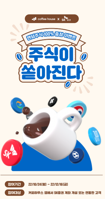 10월 24일부터 시작된 주식이 쏟아진다 이벤트는 커피하우스 앱에 가입하고 SK증권 계좌 개설이나 연동했다면 누구나 참여할 수 있습니다. 앱과 연동만 해도 무료주식을 받을 수 있는 만큼 놓치기 아쉬운 이벤트입니다.