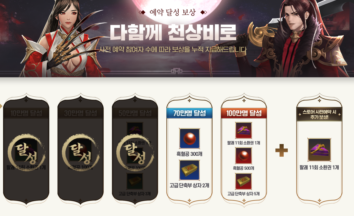 사전예약 달성에 따른 누적 보상 지급 이벤트도 함께 진행 중입니다. 10만 달성을 시작으로 30만, 50만, 760만, 그리고 100만 달성시 주어지는 인게임 보상 아이템이 상당한데요, 이미 50만 명 달성을 넘어서고 있는 만큼 100만 명 달성도 어렵지 않을 것으로 생각됩니다.