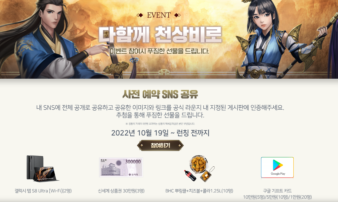 10월 19일부터 시작된 천상비M 사전예약 소식을 본인의 SNS에 전체 공개로 공유한 후 공유한 이미지와 링크를 공식 라운지 내 지정된 게시판에 인증하면 추첨을 통해 구글 기프트 카드부터 BHC 뿌링클 +치즈볼+콜라, 신세계 상품권, 갤럭시 탭 S8 울트라를 지급합니다.