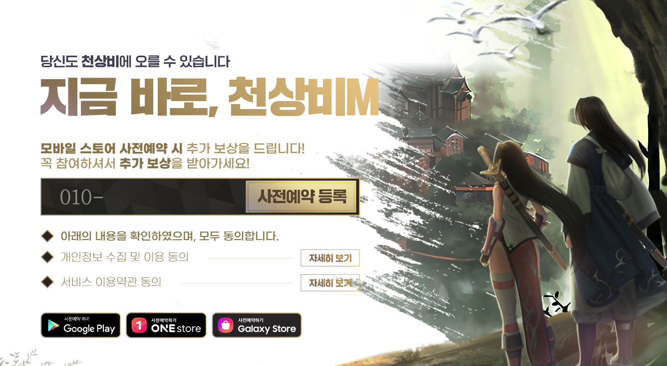 앞서 진행된 CBT에서 좋은 평가를 받아 더욱 기대를 모으고 있는 모바일MMORPG 천상비M 사전예약도 진행 중입니다. 공식 홈페이지를 통해 전화번호를 입력하면 간단히 참여 완료되며, 구글 플레이 스토어, 원스토어 그리고 갤럭시 스토어를 통해 사전예약에 참여하면 추가 보상도 받을 수 있습니다.