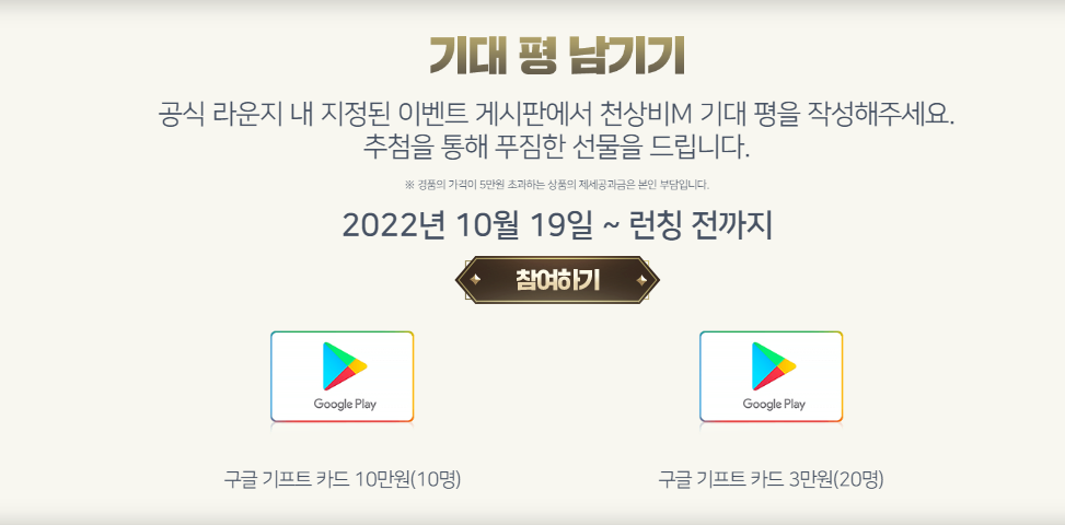 론칭 전까지 기대평 남기기 이벤트도 진행되는데요, 공식 라운지 내 지정된 이벤트 게시판에 천상비M에 대한 기대평을 작성하면 추첨을 통해 구글 기프트카드 3만 원 권과 10만 원권을 지급합니다. 이벤트 참여 방법이 어렵지 않아 누구나 쉽게 참여할 수 있는 만큼 사전예약과 함께 잊지 말고 참여해 풍성한 보상을 챙겨보시는 건 어떨까요?