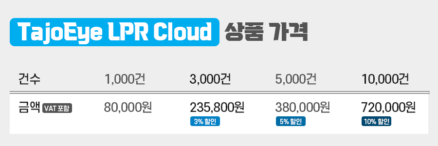 TajoEye LPR를 보다 합리적으로 이용하고 싶다면 TajoEye LPR Cloud 서비스를 선택하는 것이 방법입니다. TajoEye LPR Cloud 서비스는 솔루션을 직접 구매하지 않고 번호 인식 사용 건수를 저렴한 가격으로 구매하여 TajoEye LPR의 향상된 인식 엔진을 이용할 수 있습니다.
