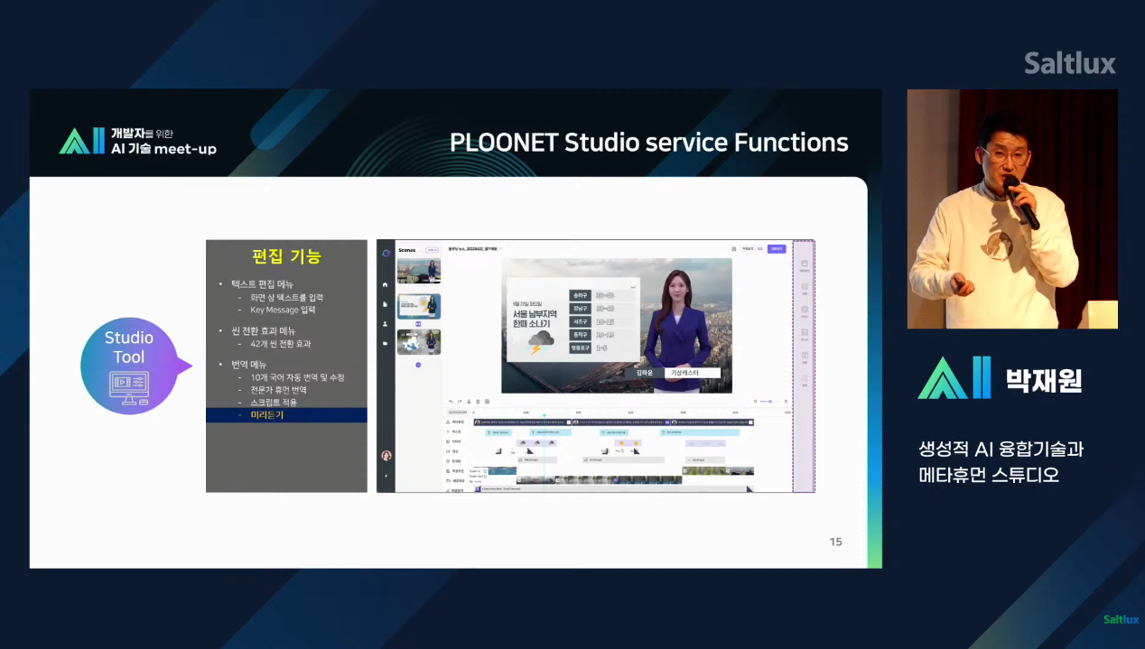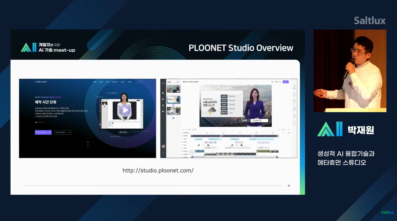 플루닛 스튜디오를 통해 진행되는 과정과 영상 생성을 위한 립싱크 얼굴 합성 모델을 만들어 가는 과정에 대한 언급도 있었습니다. 현재 플루닛에서는 AI융합 프로세스 최적화를 통해 실시간 영상 합성이 가능하고, 영상 생성을 위한 립싱크 얼굴 합성 모델이 가능하도록 구성되어 있습니다.