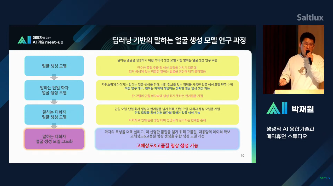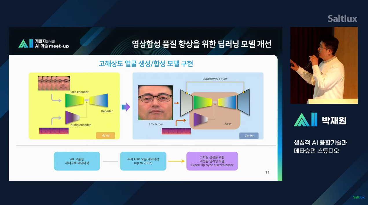 딥러닝 기반의 말하는 얼굴 생성 모델 연구 과정과 영상합성 품질 향상을 위한 딥러닝 모델 개선에 따른 내용도 공개되었는데요, 단계별 연구 과정을 보면 여러 고민을 통해 발전해 나간 모습이 인상적이었습니다. 또한 현재에 그치지 않고 향후 연구 개발 발전 방향도 제시하고 있어 앞으로에 대한 기대가 더욱 높아질 정도입니다.
