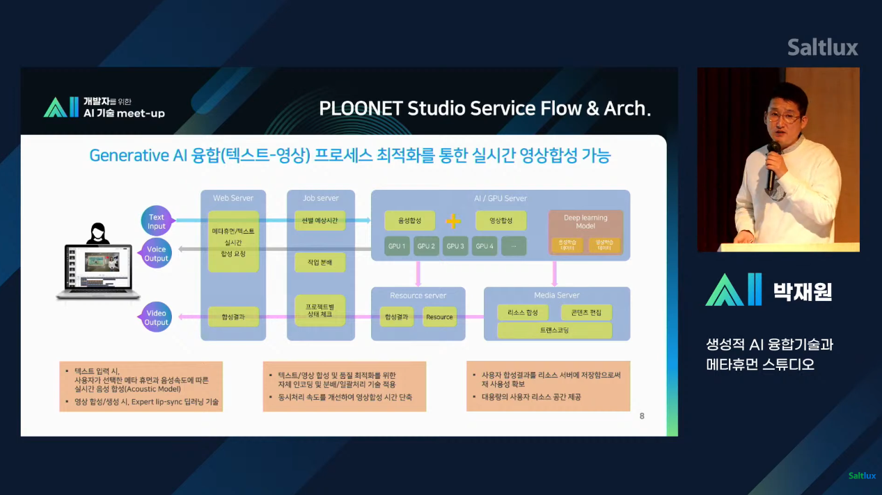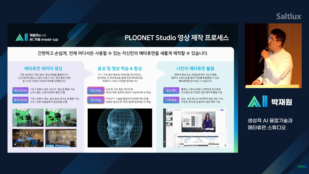플루닛 스튜디오를 통해 진행되는 과정과 영상 생성을 위한 립싱크 얼굴 합성 모델을 만들어 가는 과정에 대한 언급도 있었습니다. 현재 플루닛에서는 AI융합 프로세스 최적화를 통해 실시간 영상 합성이 가능하고, 영상 생성을 위한 립싱크 얼굴 합성 모델이 가능하도록 구성되어 있습니다.