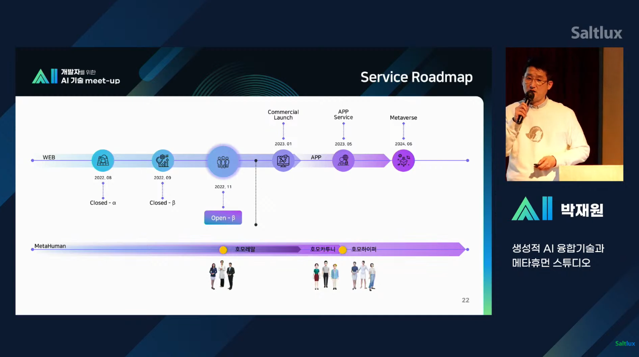 생성적 AI 융합기술과 메타휴먼 플루닛 스튜디오 개발에 대한 로드맵도 공개되었는데요, 현재 사용 가능한 메타휴먼인 호모레알을 시작으로 2023년 5월까지 호모 카투니 2024년까지는 메타버스 환경을 고려한 호모하이퍼까지 준비하고 있다고 하니 기대해도 좋을 것 같습니다.