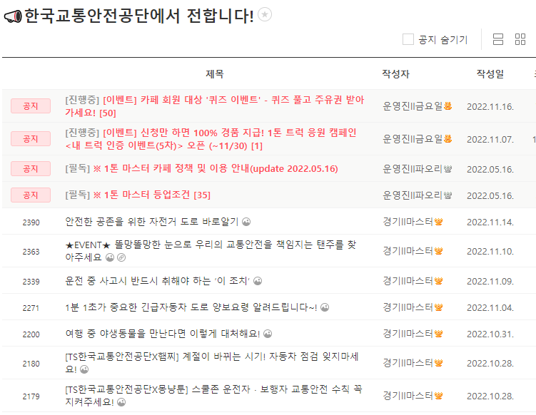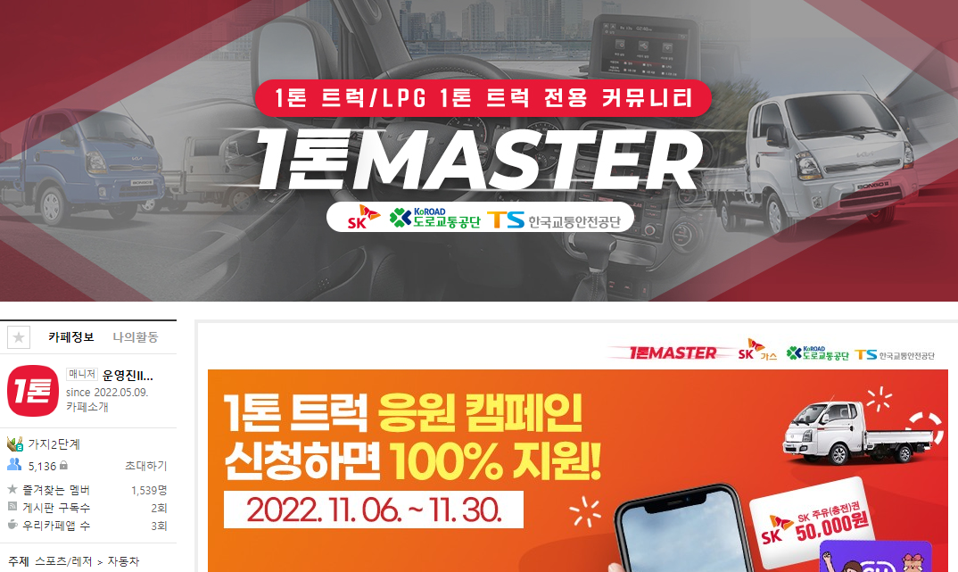 1톤 마스터는 1톤 트럭을 운행 중이거나 준비하고 계신 분들이 알아두어야할 정보와 함께 1톤 트럭커들의 비슷한 상황에 대해 이야기 나누고 공감할 수 있어 무척이나 유용합니다. 또한 관련 이벤트도 상시로 진행되어 특별한 선물도 받을 수 있는 만큼 생생한 트럭 정보와 다양한 혜택을 놓치고 싶지 않다면 네이버 카페 1톤 마스터에 가입해 모두 챙겨보시기 바랍니다.