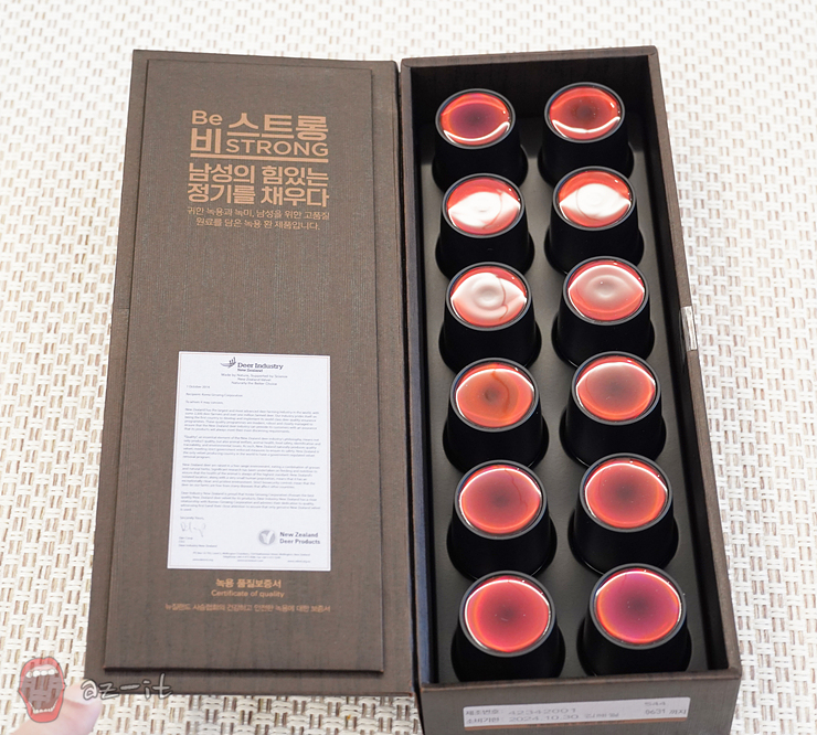 상자 안에는 총 16개로 소분되어 있는 천녹비스트롱이 영롱한 자태를 뽐내며 자리하고 있습니다. 정관장에서 보증하는 귀한 녹용(최상위 SAT등급 100%)과 녹미(사슴꼬리)와 엄격하게 관리한 6년 근 홍삼을 함께 담은 점이 특징인데요, 여기에 흑마늘, 마카, 오미자, 복분자 등의 남성 스태미나 대표 원료들을 넣어 남성을 위한 제품이라고 하니 기대가 되더군요.