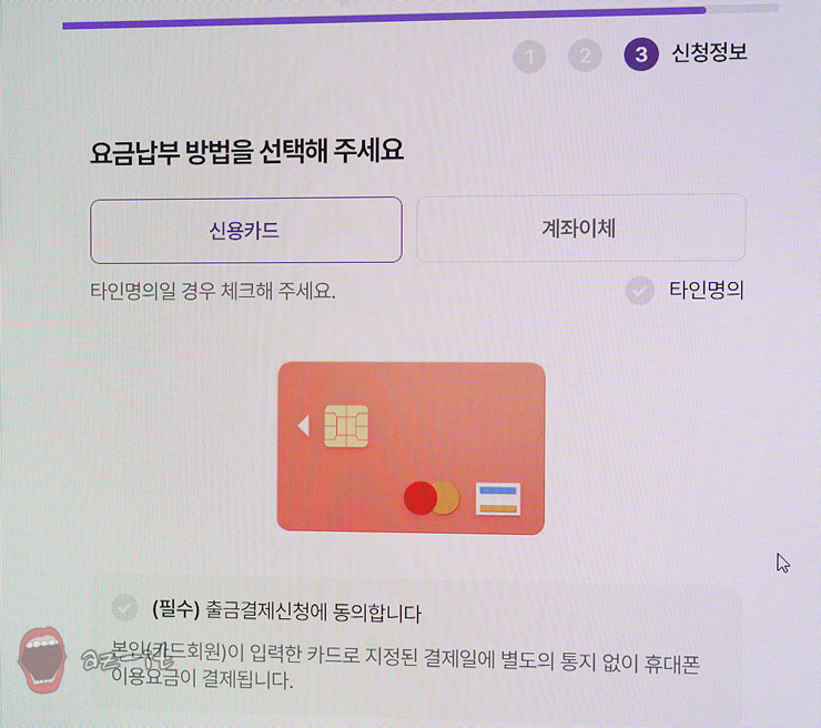 알뜰폰요금제 선택 이후 개인정보를 기재하고 본인인증을 통한 절차를 진행한 후 요금 납부 방법까지 선택했습니다. 요금납부는 카드와 계좌이체 모두 가능해 원하는 방식을 선택할 수 있더군요. 상황에 따라 타인명의 요금납부도 가능하도록 구성되어 있었습니다.