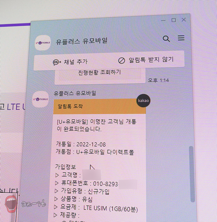 가입신청과 함께 바로 개통할 수 있다는 메세지가 전달되고 이후 개통 처리가 중이라는 안내를 받았는데요, 최장 3분이라는 말이 무색하게 얼마 지나지 않아 개통되었다는 알람을 받을 수 있었습니다.