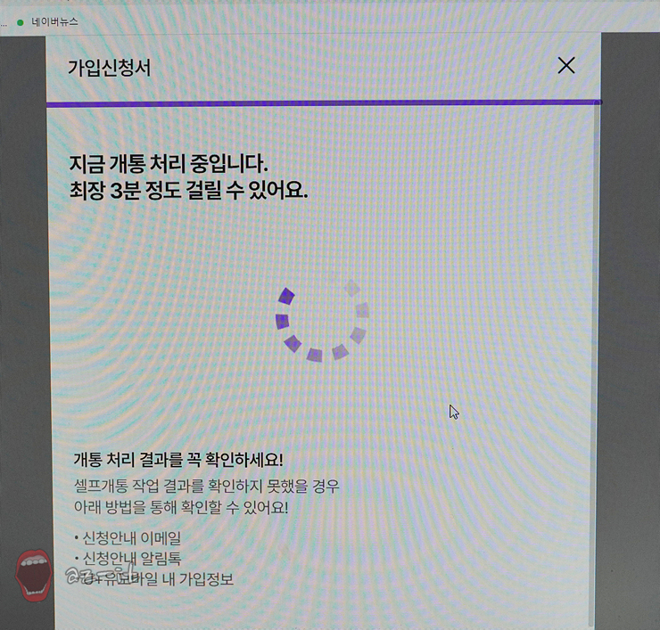 가입신청과 함께 바로 개통할 수 있다는 메세지가 전달되고 이후 개통 처리가 중이라는 안내를 받았는데요, 최장 3분이라는 말이 무색하게 얼마 지나지 않아 개통되었다는 알람을 받을 수 있었습니다.