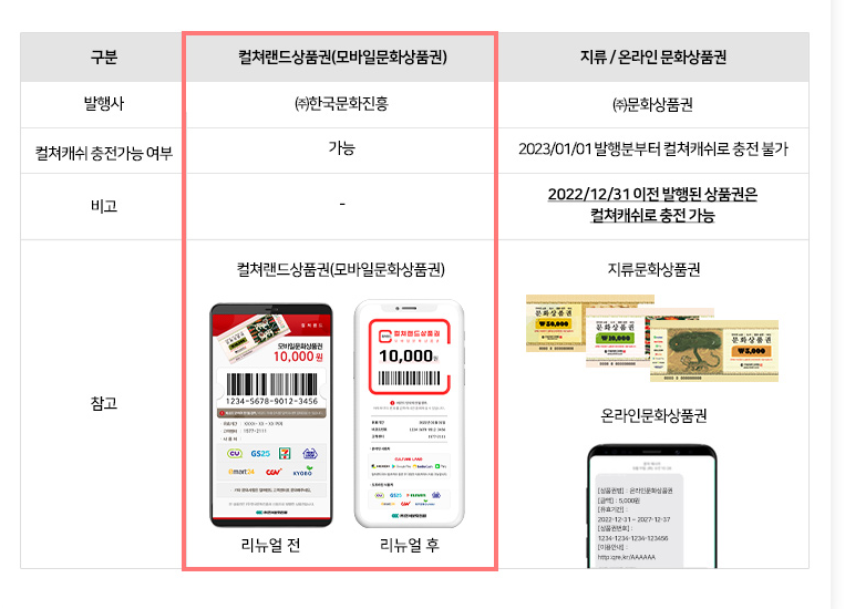 온. 오프라인에서 자유롭게 사용하던 지류/온라인 문화상품권과 컬쳐랜드 제휴가 종료될 예정입니다. 문화상품권은 컬쳐랜드에서 발행하는 걸로 인지하고 이해가 안 되는 분들도 계실 텐데요, 지류/온라인 문화상품권과 모바일 문화상품권의 발행처는 각기 달라 그동안 제휴를 통해 컬쳐랜드에서 자유롭게 쓸 수 있었던 만큼 앞으로는 발행일자 기준으로 컬쳐랜드 충전 가능 여부가 달라지게 됩니다.