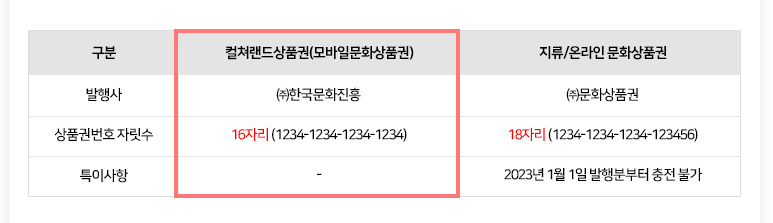 컬쳐랜드상품권(모바일문화상품권)과 지류/온라인 문화상품권의 가장큰 차이점은 발행사입니다. 컬쳐랜드 상품권은 (주)한국 문화진흥이고, 지류/ 온라인 문화상품권은 (주)문화상품권에서 발행합니다. 또한 상품권 번호 자릿수도 달라지는데요, 컬쳐랜드 상품권은 16자리로 된 상품권번호를 가지고 있으며 지류/온라인 문화상품권은 18자리로된 상품권번호 자릿수를 가지고 있어 이를 활용해 구분할 수 있습니다.