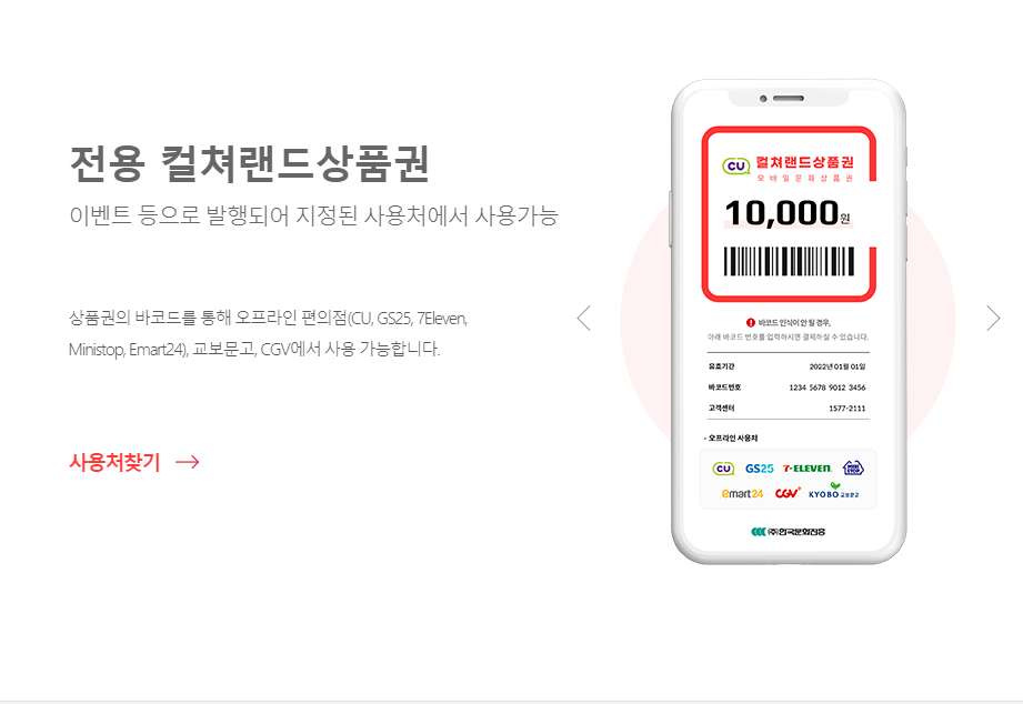 올해 구매한 컬쳐랜드 상품권(모바일문화상품권)의 경우 내년에도 지속적으로 사용가능하기 때문에 지류/온라인 문화상품권 제휴가 끝나는 부분에 대해 신경쓰지 않아도 되는데요, 상품권 바코드 결제로 오프라인에서도 간편하게 사용 할 수 있어 올해도 내년에도 별다른 불편함 없이 사용 가능합니다.