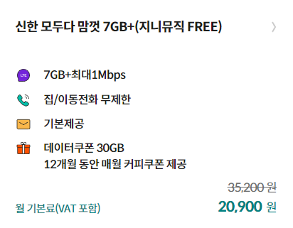 수많은 혜택을 받을 수 있는 신한 SOL 요금제는 크게 3가지로 구성되어 있어 데이터 사용량에 따라 선택할 수 있습니다. 먼저 신한 모두다 맘껏 7GB+(지니뮤직 FREE) 는 데이터 7GB + 최대 1Mbps 무제한 / 통화 무제한/ 문자 무제한 조건으로 월 2만 원대 비용으로 사용할 수 있습니다. 여기에 지니뮤직을 마음껏 사용할 수 있는 점도 놓칠 수 없는 특징입니다.